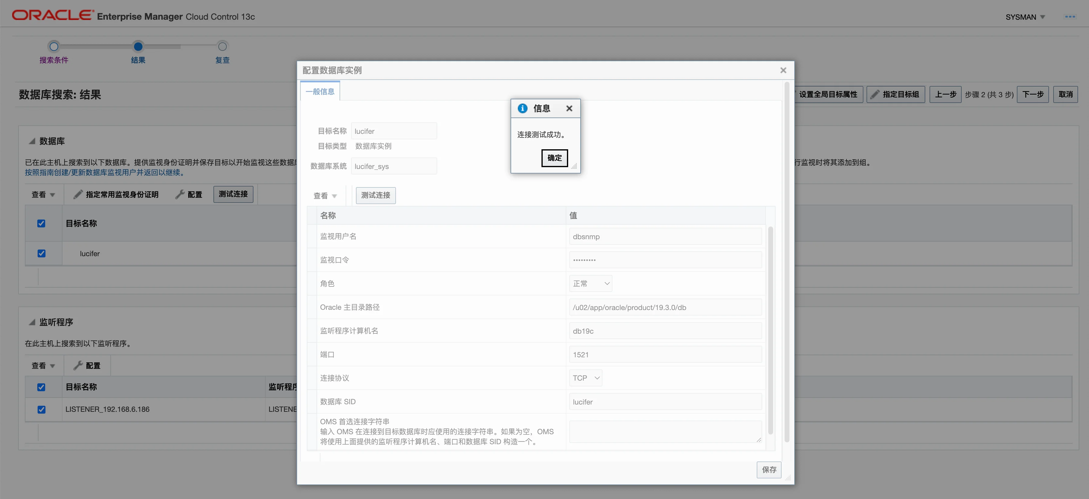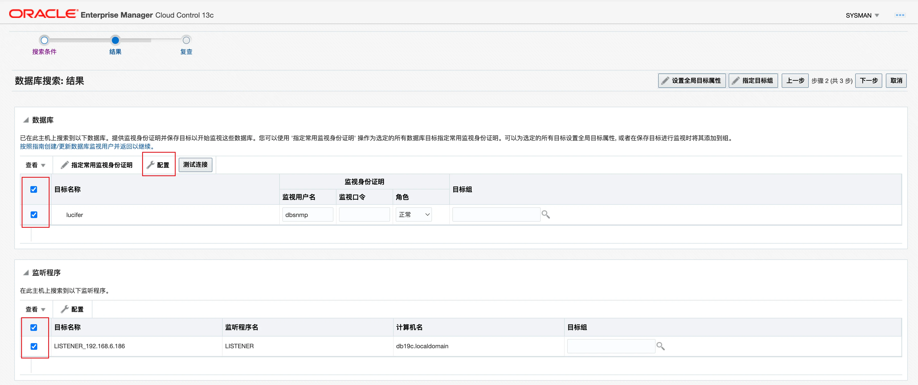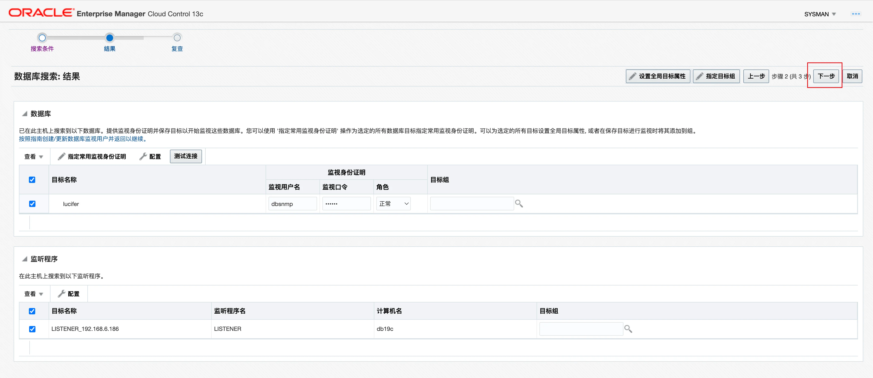这里配置之前,需要解锁 dbsnmp 用户并且设置密码,否则会报错:
