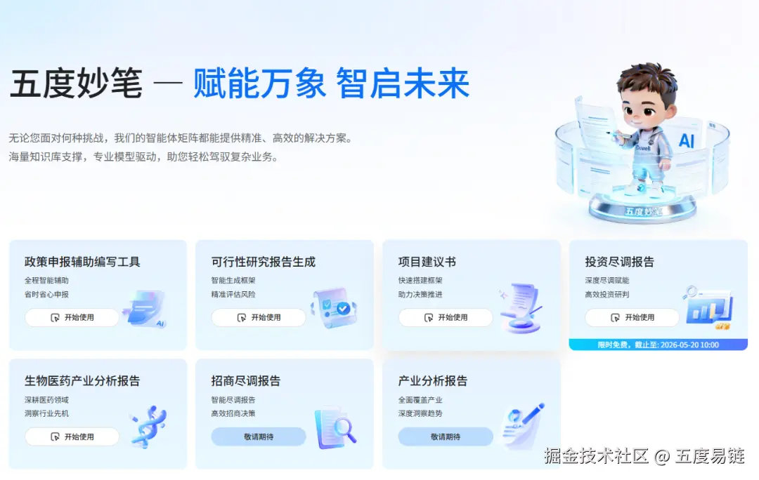 目前,五度妙笔已覆盖多种核心业务场景,支持政府申报辅助编写、 可行性研究报告、项目建议书、投资尽调报告、生物医药产业分析报告等多种报告类型的智能生成。系统将传统数天的报告撰写周期压缩至分钟级,把重复劳动交给引擎,把决策判断留给自己——你不再是文字的搬运工,而是决策的定调者。