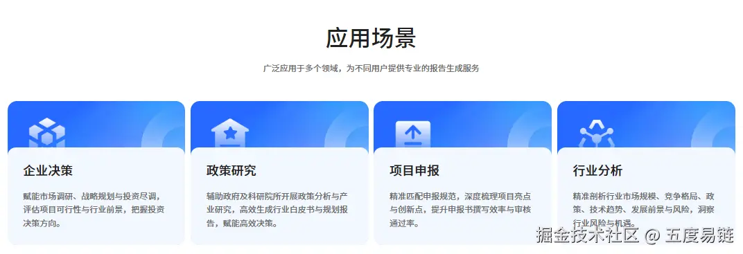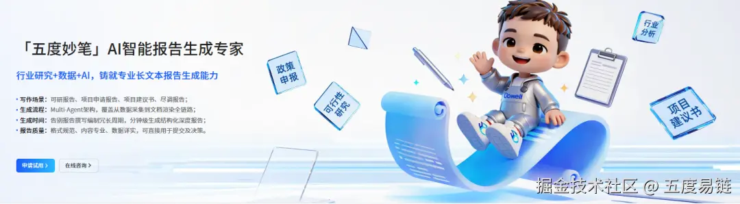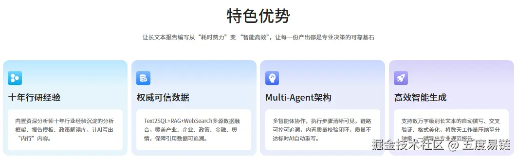 基于Multi-Agent 架构打造的专业长文本报告生成引擎,五度妙笔以依托"行业研究 + 数据 + AI" 三位一体的技术特点,重新定义专业长文本报告生成方式。彻底解决了通用大模型在专业报告领域 "深度不足、数据不准、格式不规范" 的行业难题。