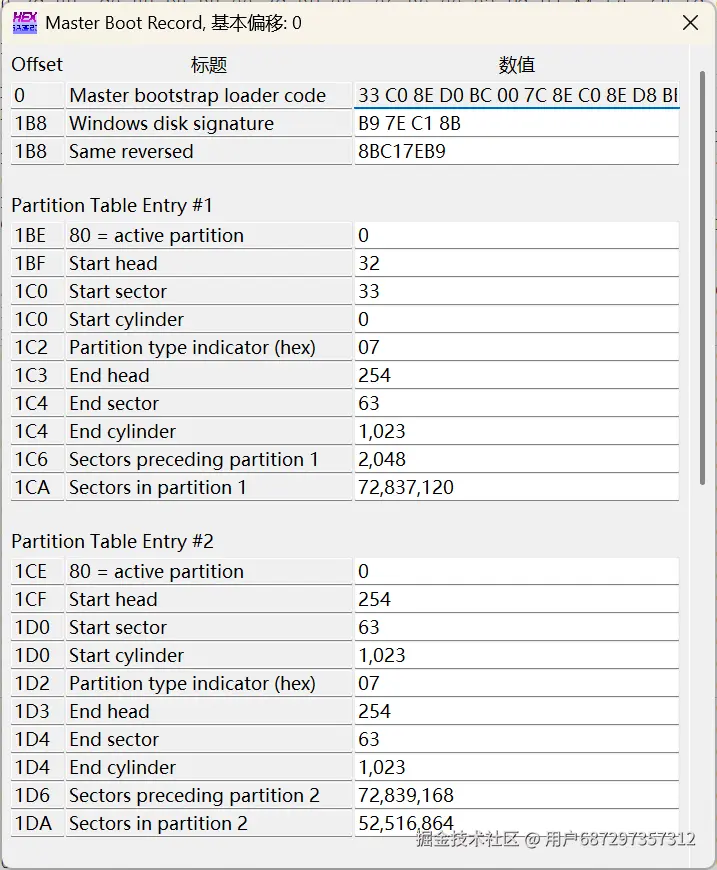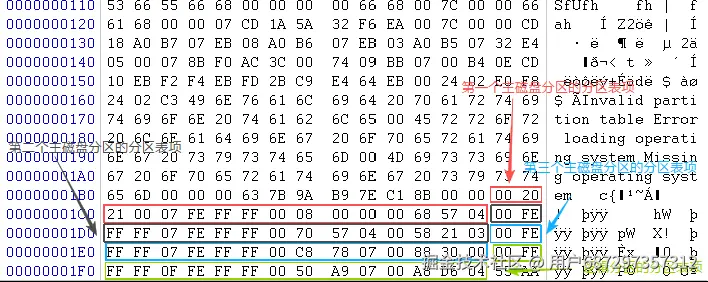 使用winhex打开硬盘查看,其MBR及分区表信息如下: