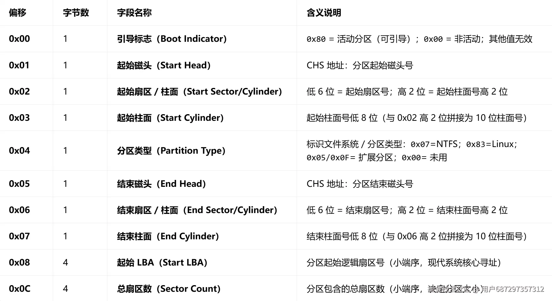 0x00:空表项(未使用)0x07:NTFS(Windows 主分区)0x0B / 0x0C:FAT320x05:传统扩展分区(CHS)0x0F:LBA 扩展分区(现在都用这个)0x83:Linux 主分区0x82:Linux swap 交换分区
