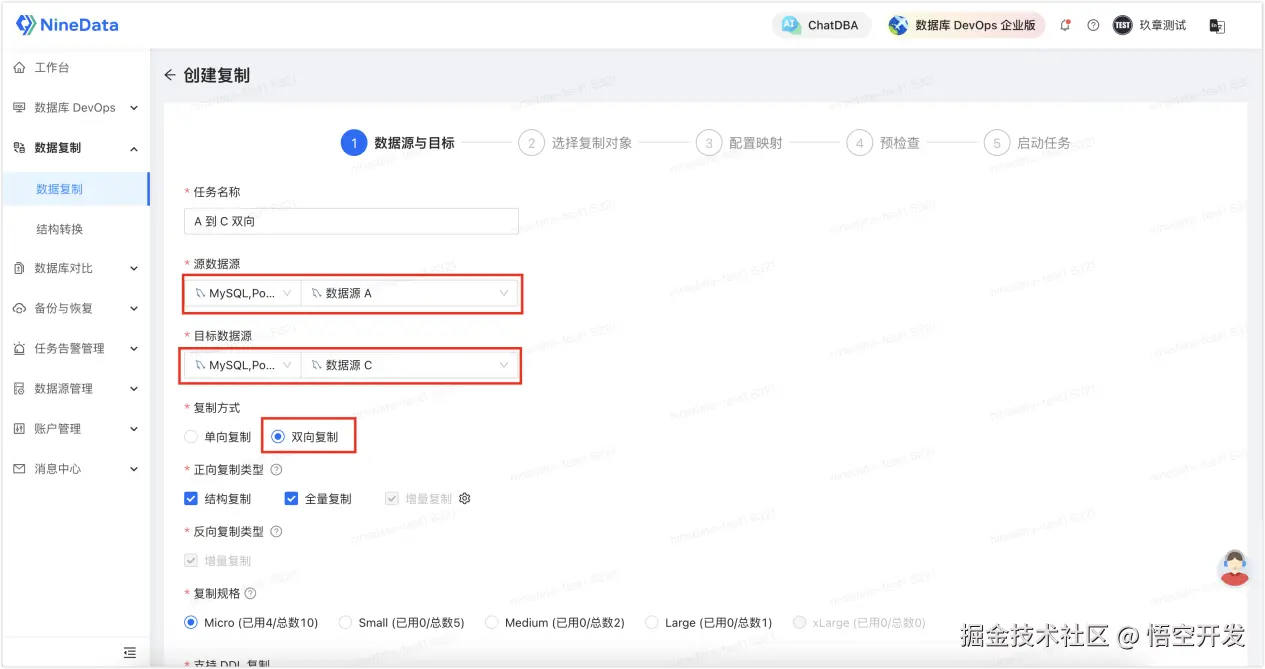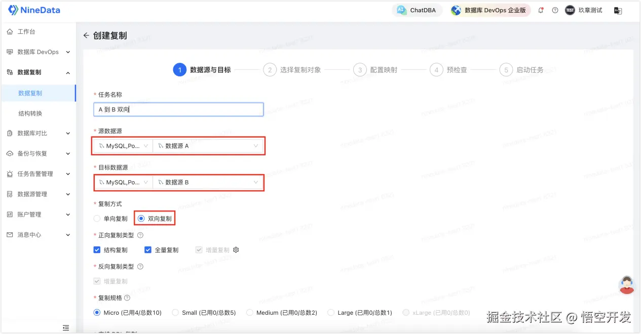 图5:在NineData中创建A到B的双向复制任务,用于承接双活链路