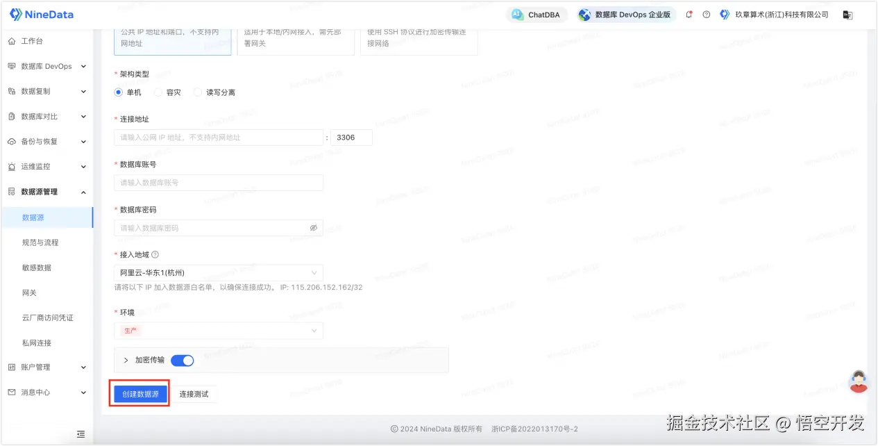 以MySQL为例,NineData数据复制产品通常先在数据源管理中选择数据库类型,再填写连接地址、数据库账号、密码、接入地域等信息,把数据库实例接入平台。这个动作看起来很基础,但它决定了后面所有复制链路是不是建立在统一入口之上。