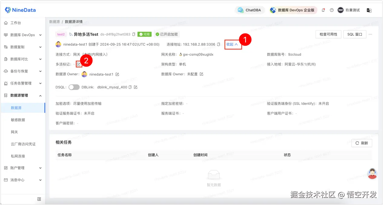 图3:NineData在数据源详情页配置多活标记,为后续双活/多活复制链路建立边界