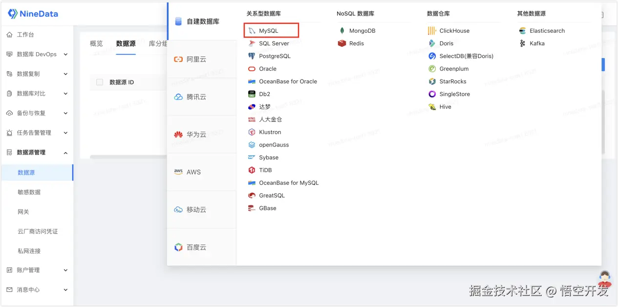 图1:在NineData中选择MySQL数据源类型,作为后续容灾和多活链路配置的起点