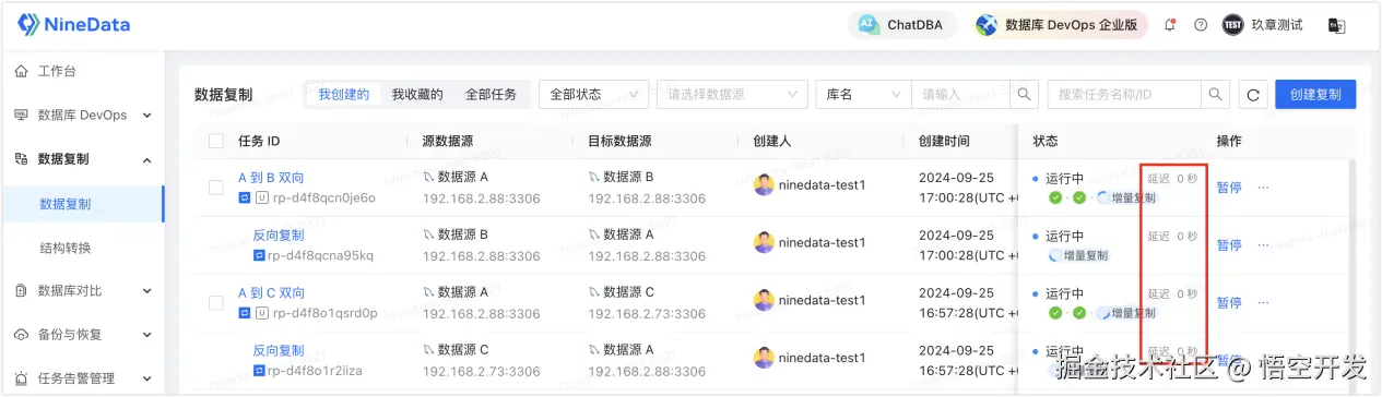 当双向复制和多节点复制任务建立完成后,平台侧就可以统一查看任务状态、复制方向、运行情况和延迟信息。对生产团队来说,这一步的意义非常大,因为他们最终关心的不是截图里有几条任务,而是链路是否稳定、延迟是否可控、切换时是不是有依据。