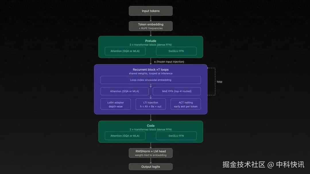 此次开源的核心技术是带有混合专家(MoE)路由机制的循环深度Transformer(RDT)。与传统大模型不同,RDT采用了一种更加高效的设计思路——同一组权重最多反复运行16遍,但每次激活的是不同的专家路径。这意味着它可以在不增加参数量的情况下,实现更强的模型表达能力。