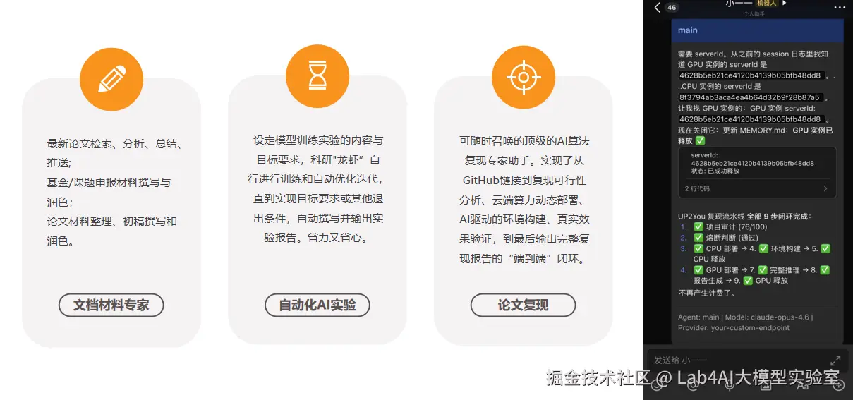 Lab4AI提供的文档材料专家与自动化AI实验能力集成的OpenClaw科研专家Agent,作为科研人员的“超级外脑”,可辅助参会者完成综述撰写——快速梳理三维视觉领域的最新顶会论文,为选题立项提供有力支撑;可实现自动化AI实验——针对三维生成任务,自动化、智能化进行超参数调优与训练监控,优化研究设计、提升实验实施效率;还可提供论文写作辅助,帮助参会者在会议期间整理思路,辅助撰写会议纪要或论文初稿,助力论文撰写高效推进。