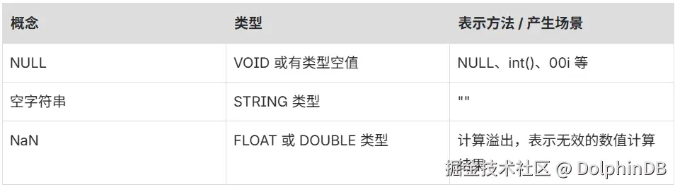 DolphinDB 里的空值怎么表示?看看下面的表格就清楚了。