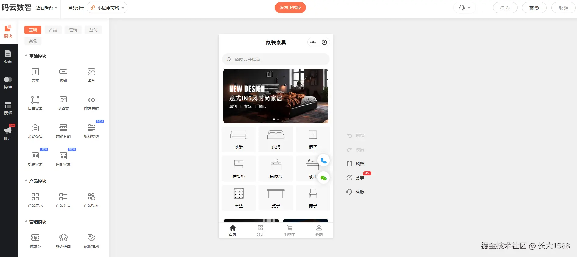 拖拽式编辑:通过可视化界面自由修改布局、配色和图文,左侧组件库包含轮播图、导航栏、商品展示区等组件,右侧属性面板可调整样式,全程“所见即所得”。