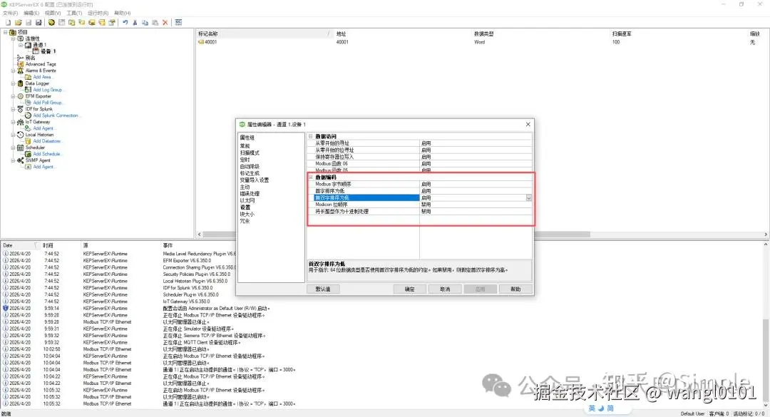 关键点:字节顺序 (Byte Order)。如果读上来的数值不对(比如应该是很大的正数,结果是很小的负数或零),很可能是字节顺序的问题。可以在“高级”属性中尝试调整“字节顺序”。