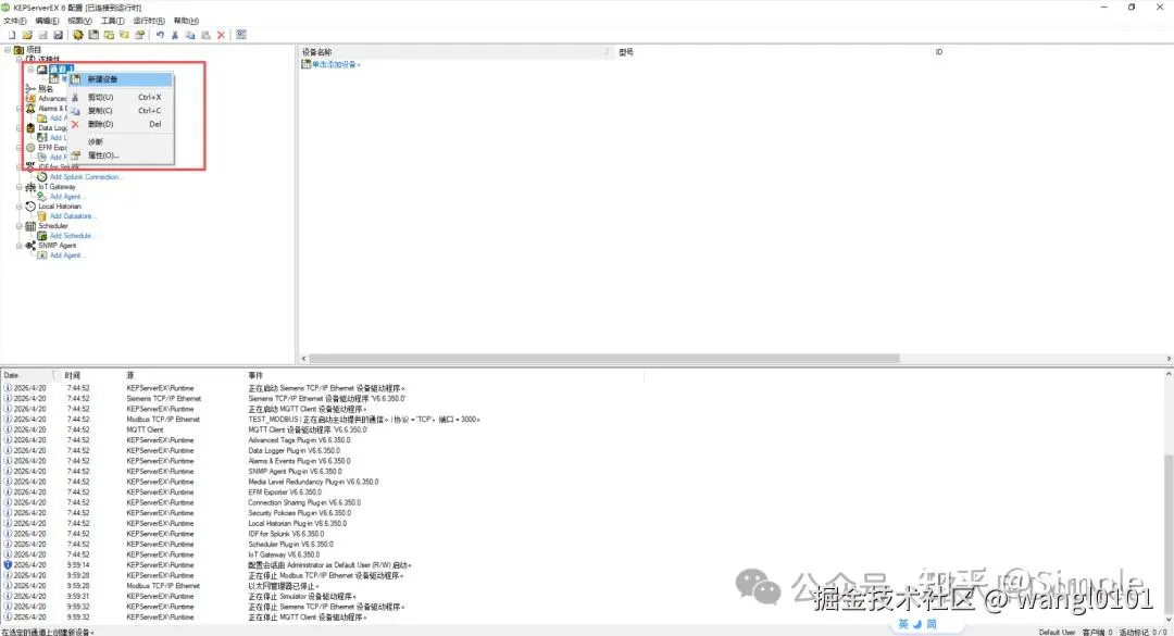 在刚创建的通道下,右键点击“设备”,选择“新建设备”。