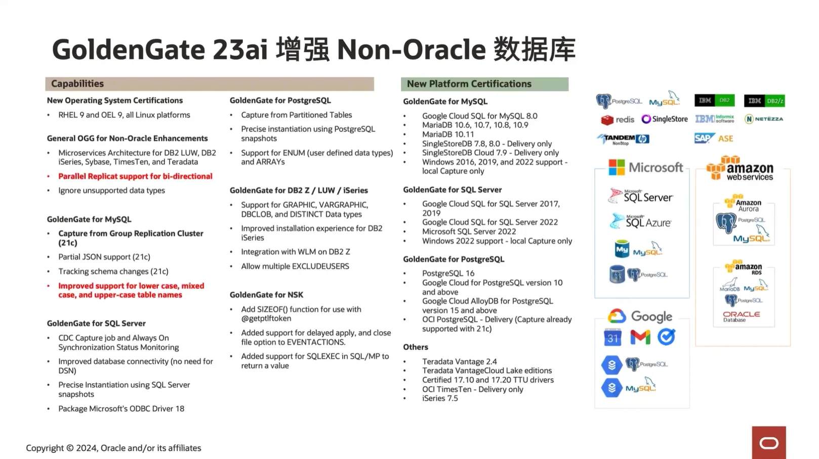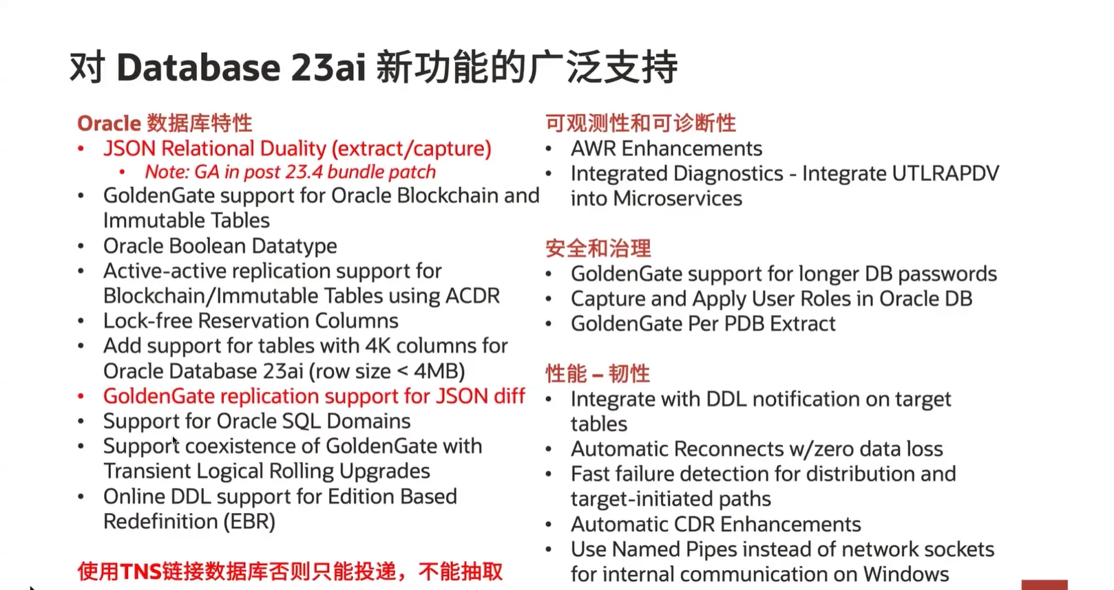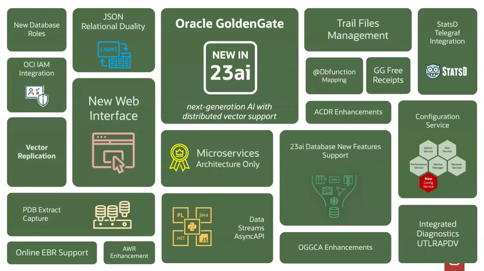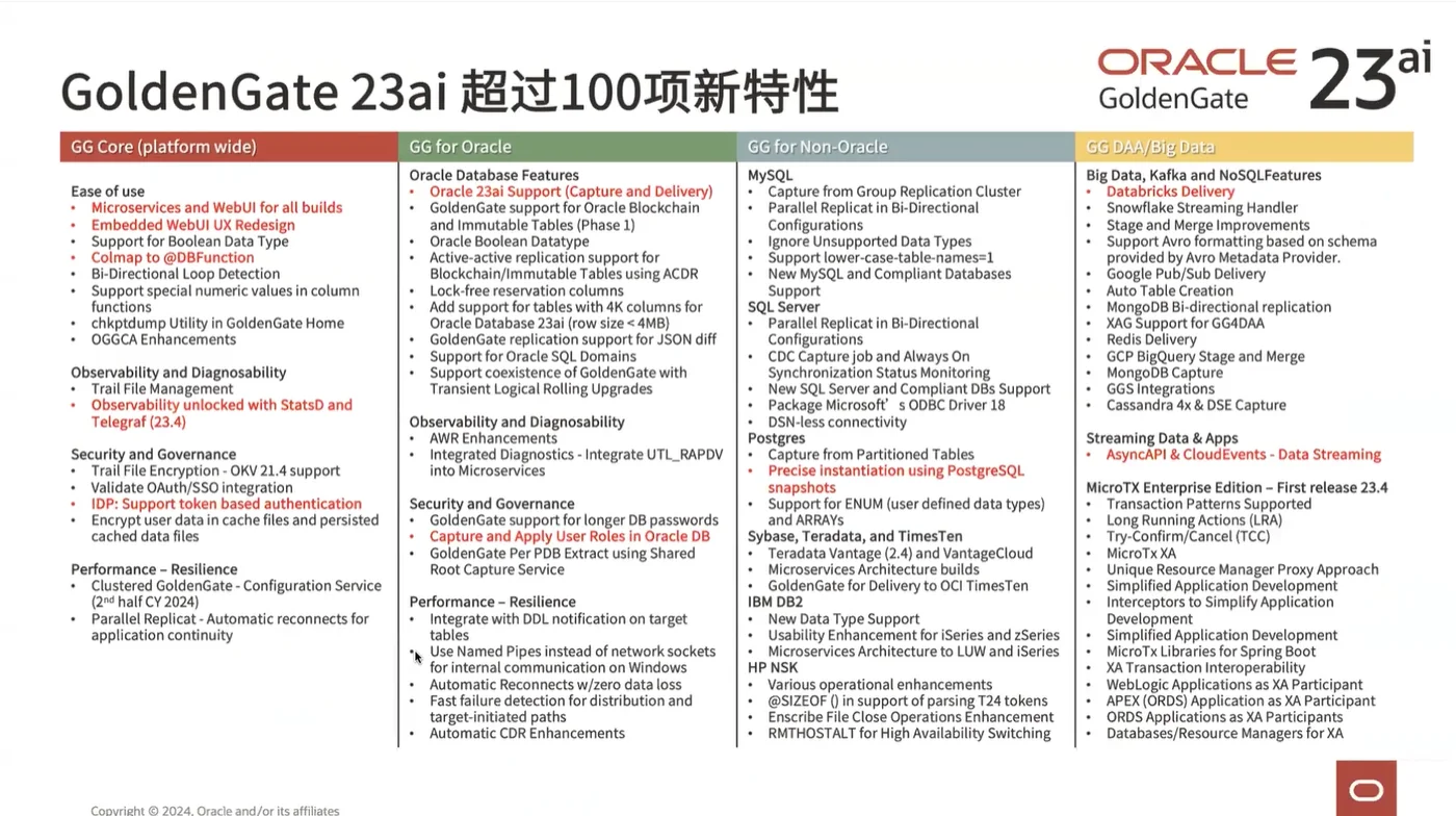在 23ai 版本中,OGG 推出了超过 100 项新特性,涵盖架构、AI 集成、高可用、运维体验等多方面,致力于提升用户体验并全面拥抱 AI。