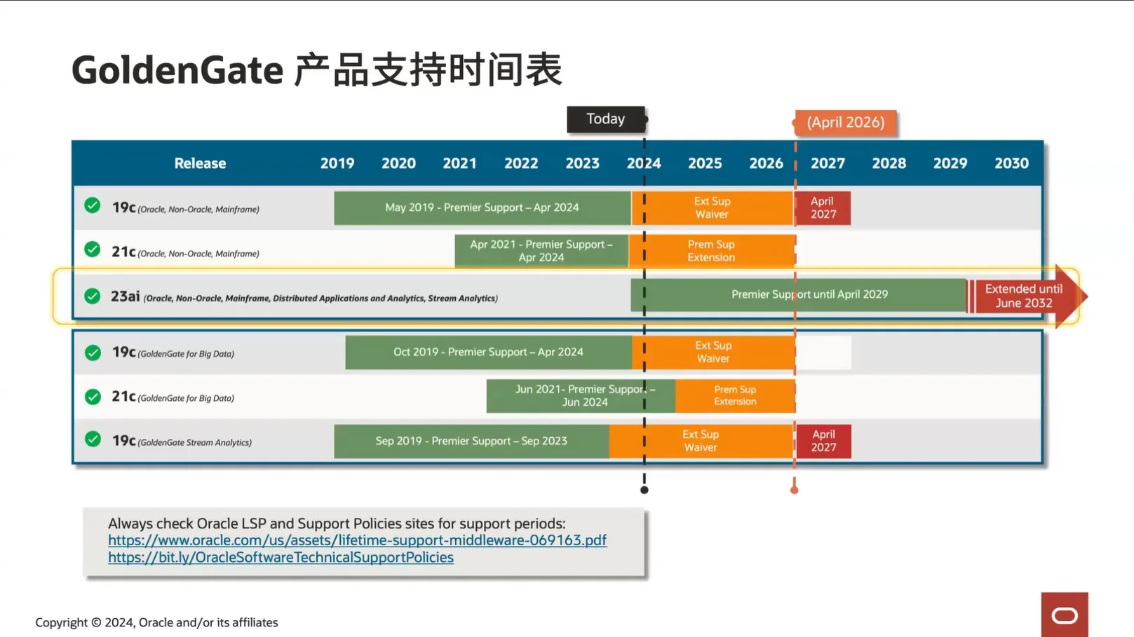 从官方支持时间表可以看出,Oracle 正将重心转向 23ai。19C 与 21C 的主流支持即将结束,而 23ai 版本的支持将延长至 2032 年,标志着其作为长期战略版本的地位。