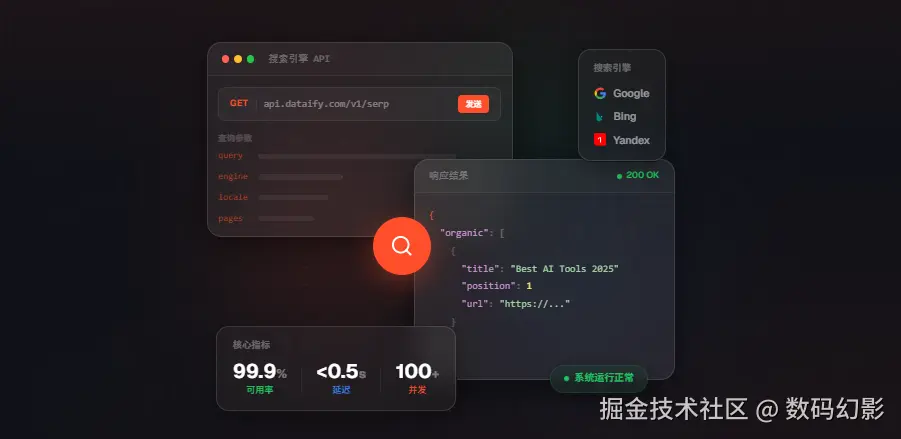 操作门槛低,无需专业的技术团队,只需调用简单的GET请求(api.dataify.com/v1/serp),设置query(搜索关键词)、engine(目标搜索引擎)、locale(地区/语言)、pages(采集页数)等基础参数,即可返回标准JSON结构化数据,包含标题、排名、链接、摘要等关键信息,无需额外解析,可直接对接企业现有业务系统和工作流程,大幅提升工作效率。