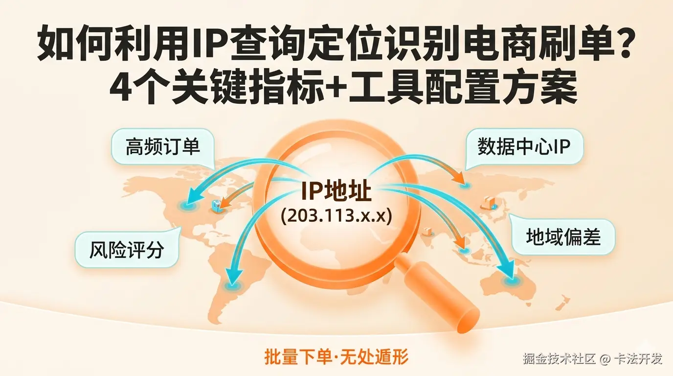 “老板,这个爆款的订单量不对劲——同一个IP下了20多单,收货地址天南地北。”大促值班夜,风控系统突然告警。我调出日志,查了这批IP的归属地和网络类型,清一色的数据中心网段。针对“刷单团伙利用数据中心IP批量下单”这一行为,可以利用IP查询定位服务提取多个可量化的风险指标,并结合规则引擎实现自动化拦截。本文结合真实案例,拆解4个关键指标及工具配置方案。