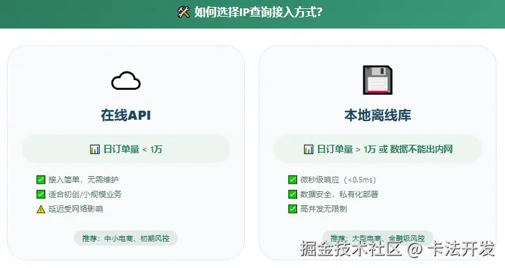 | 日订单量 > 1万,或数据不能出内网 | 本地离线库 | 微秒级响应,数据安全 |