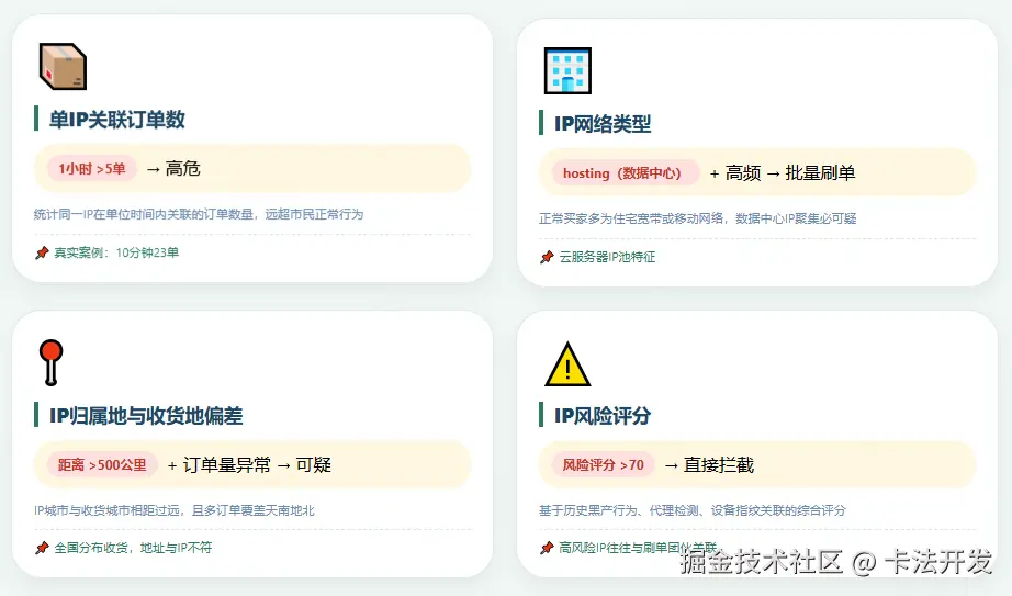 | ③ IP归属地与收货地偏差 | 对比IP归属地城市与收货地址城市,计算地理距离 | 距离 > 500公里且订单量异常 → 可疑 | IP查询库 + 订单收货地址 |