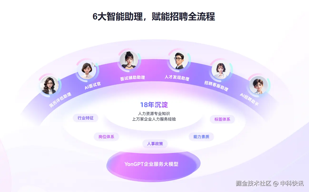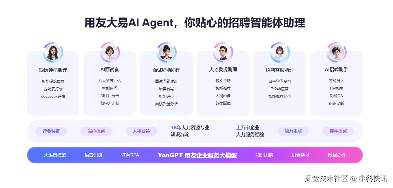 这些 AI Agent 不是孤立工作的,而是通过 YonGPT 大模型实现 "信息共享、协同决策",形成一个 "招聘智能中枢",让招聘决策更科学、更高效。