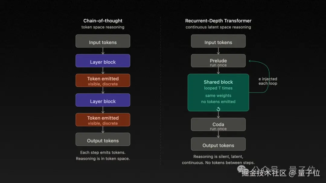 这和 Chain-of-Thought 完全不同。CoT 是 “想一步,写一步,再想一步,再写一步”,中间 token 全部暴露给人类阅读。