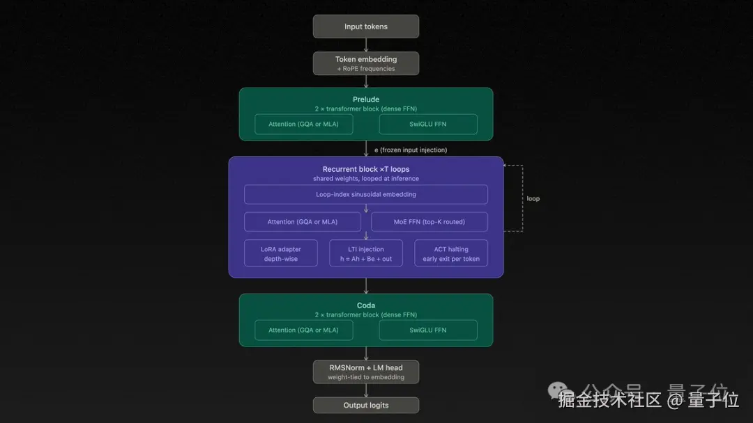 循环块内部用了混合专家层,MoE 路由器在每次循环中激活不同的专家子集。