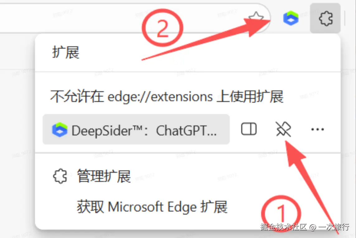 搜索DeepSider ,再单击获取。在初次安装插件后,若DeepSider的图标没有出现在浏览器右上角,请点击扩展图标,再点击DeepSider右侧的固定按钮,将其固定在浏览器功能栏上。