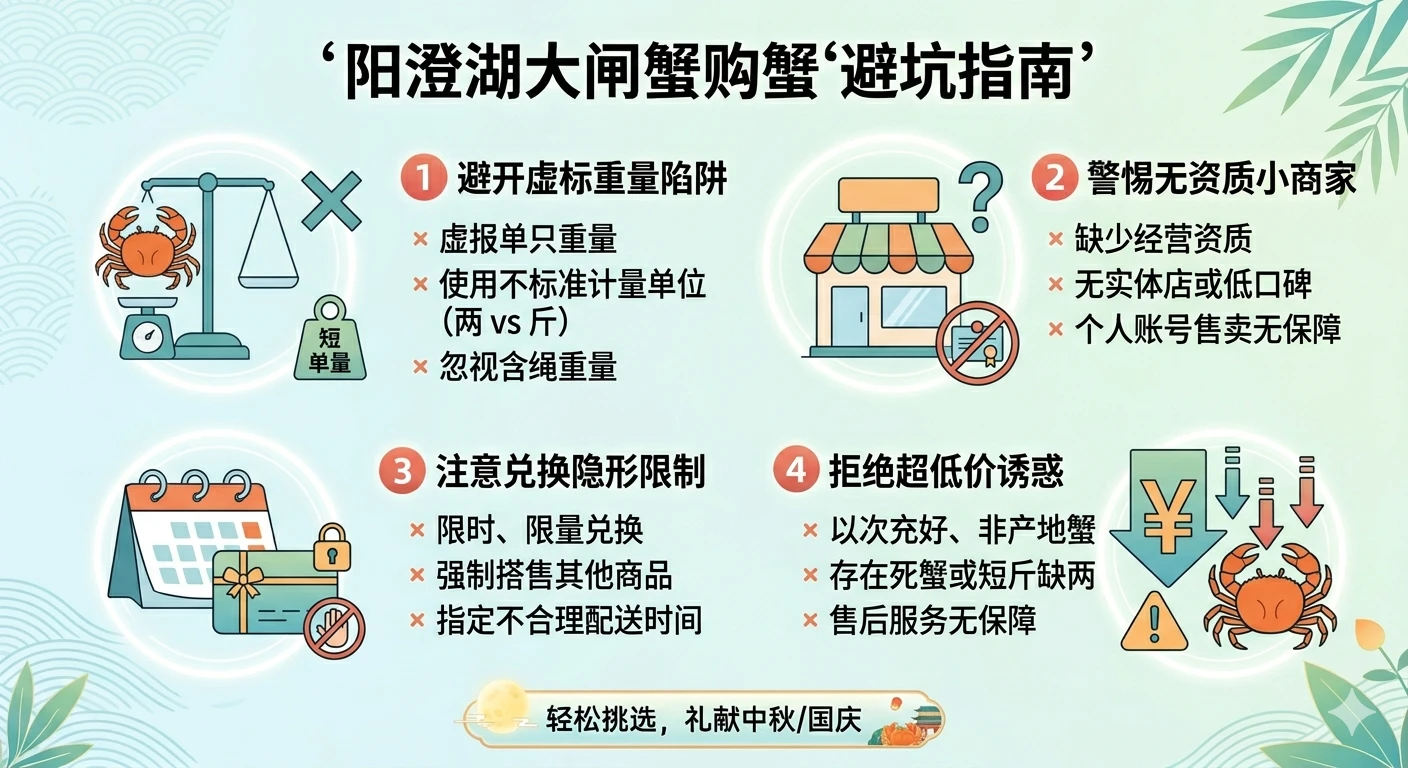 没有地理标志授权的商家,大概率是用外地蟹冒充阳澄湖蟹,哪怕价格再低也别碰,吃不到正宗蟹味还丢面子。 - 注意兑换隐形限制