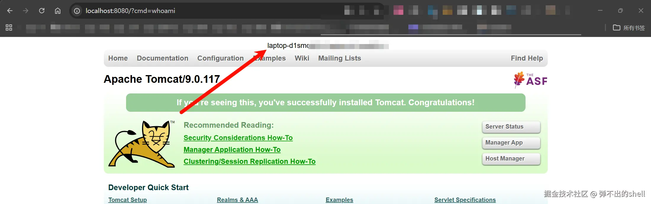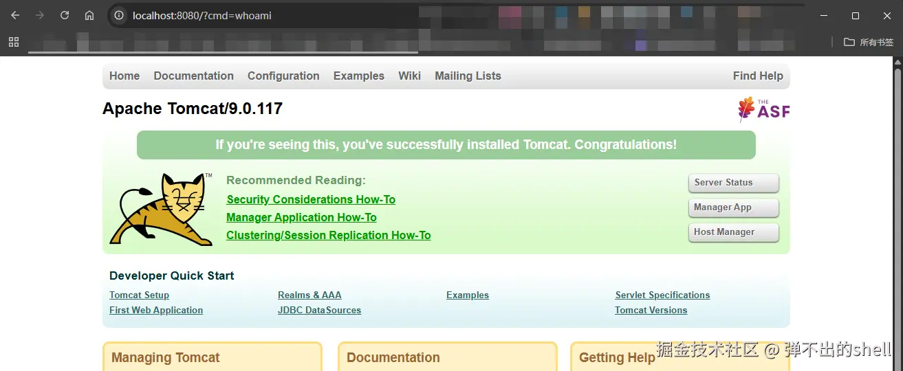 再次访问 http://localhost:8080/?cmd=whoami,浏览器有回显,注入成功: