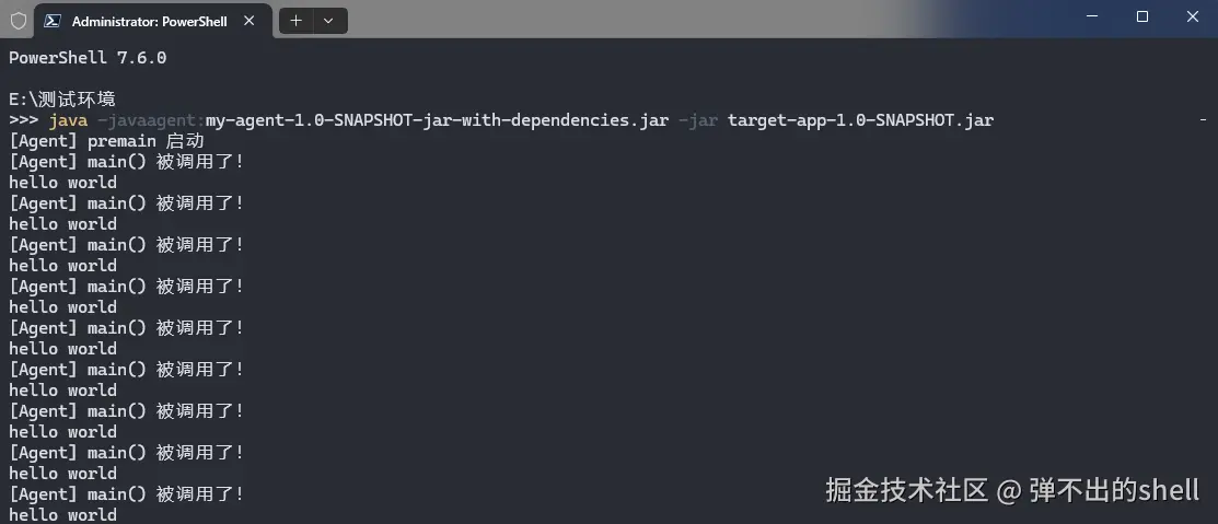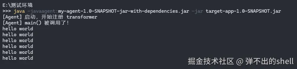 写一个 Agent,让它在目标程序的某个方法被调用时,在控制台打印一条日志,纯粹是为了验证"修改字节码→影响方法行为"这个机制是真实有效的。