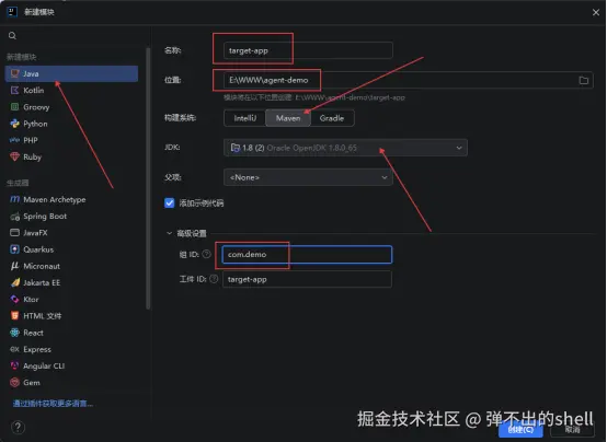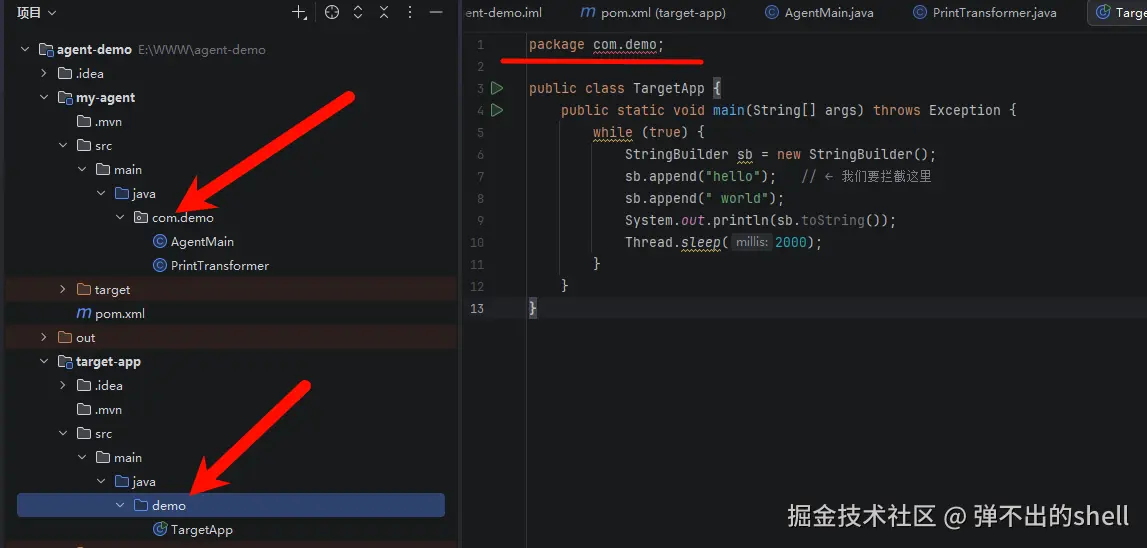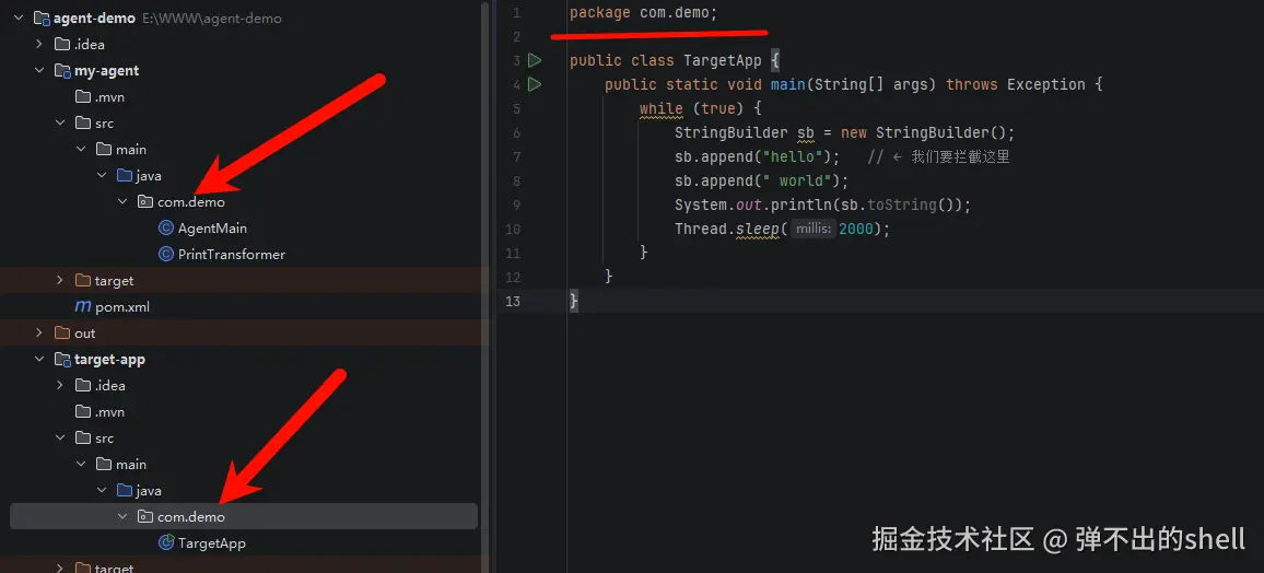 做一个**静态注册(premain)**的示例——就是 JVM 启动时通过 -javaagent 挂载,不涉及 Attach,是最基础的入门形式,先把 Instrumentation 机制摸透。