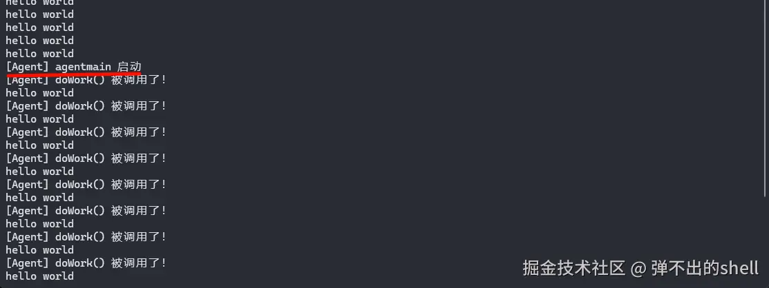 运行起来每2秒打印一行 hello world,没有任何 Agent 的情况下就是这个效果。
