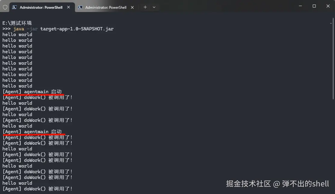TargetApp的打印逻辑故意拆成了两个方法,而不是都写在main()里。原因是main()只被调用一次,进入while(true)之后就不会再调了,retransform改完字节码也没机会生效。而doWork()每次循环都调用一次,注入完之后下一次循环就能看到效果。这正好对应 Tomcat 的场景:Tomcat 启动 →main()只跑一次,HTTP 请求进来 →doFilter()每次都调用。