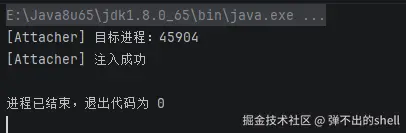 把 pid 填进 Attacher,在 IDEA 里运行,Tomcat 终端显示注入成功: