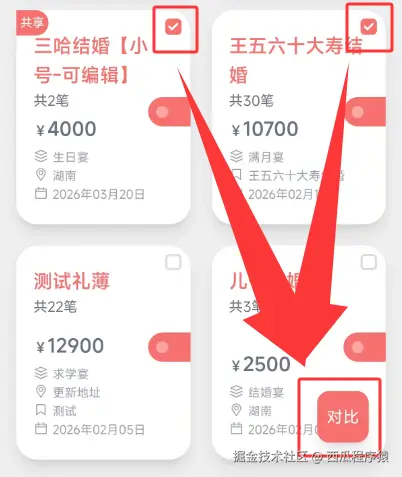 打开记了么小程序,在首页-收礼-礼薄本,勾选你需要核对的两场礼簿(比如“婚礼礼簿”和“满月宴礼簿”),不管是同一场地的不同场次,还是不同年份的人情记录,都能自由选择,每次支持选择2-5个礼薄进行对比。