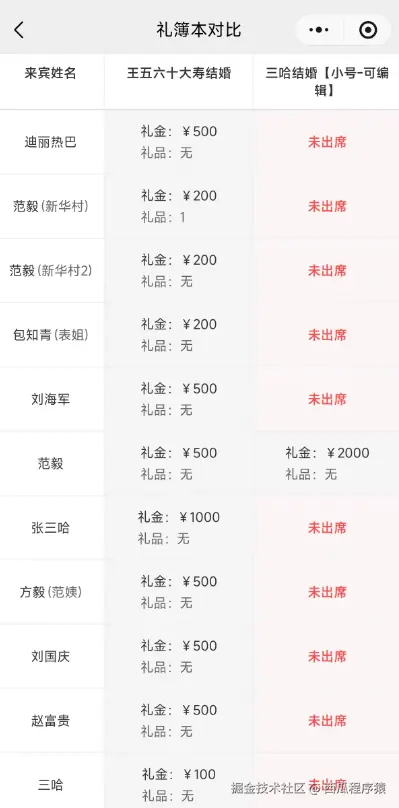 点击右下角「对比」按钮,系统会自动生成结构化的对比表,表格里会清晰列出:来宾姓名、随礼金额、随礼礼品、是否出席随礼。