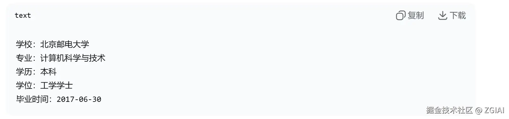 目前市面上有现成的API可以直接调用。比如ZGI平台提供的入职档案自动解析能力,封装了上述流程,支持身份证、毕业证、学位证、离职证明等20+种常见证照的识别,开发者接入后可直接返回结构化数据,省去了自己训练模型的成本。