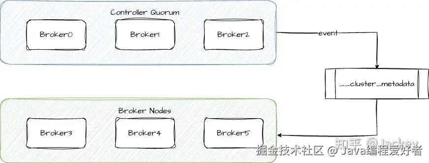 对于元数据的存储,KRaft 维护了一个内部 Topic __cluster_metadata,所有的集群变更都会作为一条条消息写入到这个 Topic 中,集群内的其他 Broker 通过消费这个 Topic 的消息来感知集群变更。Broker Nodes 节点作为业务节点,只负责数据的读写。