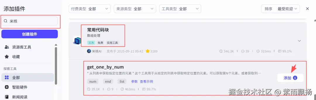在循环体后面添加一个第三方米核的【常用代码块】的【get_one_by_num】节点->设置参数