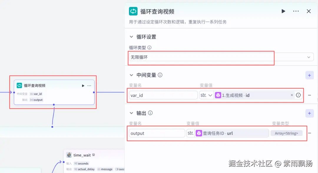 在生成视频节点后面添加一个扣子官方的【循环】节点->设置参数