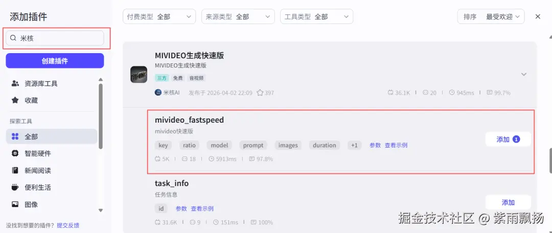 在循环体里添加一个第三方米核的【MIVIDEO生成快速版】的【task_info】节点->重命名为查询任务->设置参数