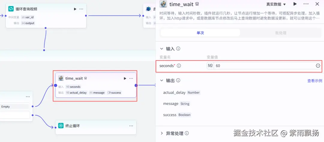 在 【time_wait】 节点后添加扣子官方的 【继续循环】 节点。