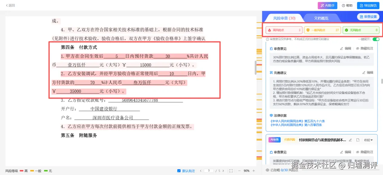 风险初筛,分钟级完成。 系统支持文档类型自动识别和解析,上传合同后,能自动提取并分类付款条件、违约责任、知识产权、保密协议等核心条款。可按高、一般、无三级风险色标标注风险等级。
