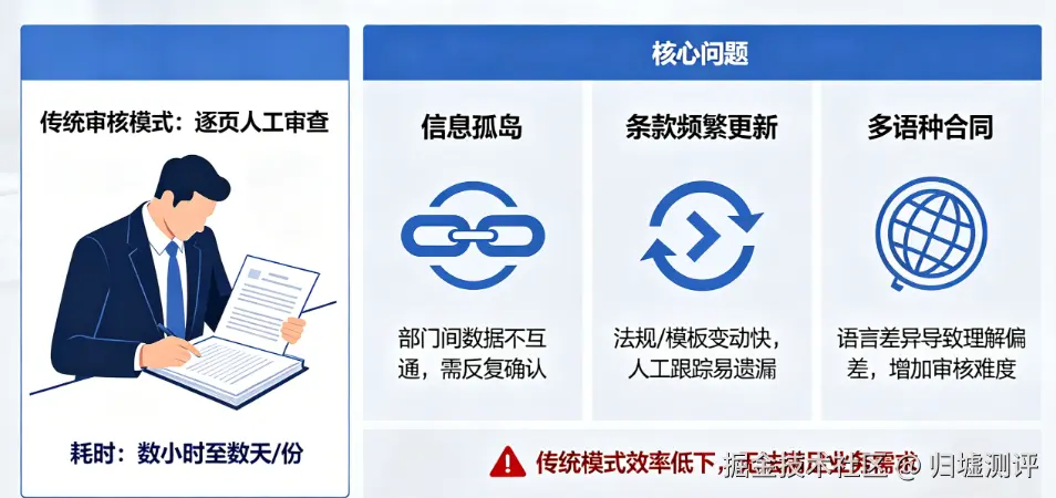 市场快速扩张的背后,是真实存在的痛点。法务人员审一份几十页的合同,通常需要投入数小时甚至数天时间。更麻烦的是,信息孤岛、条款频繁更新、多语种合同增多等问题,让传统审核模式日益力不从心。一份统计显示,83%的企业曾因合同管理漏洞遭受重大损失。