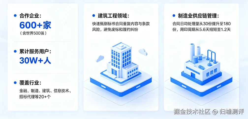 在建筑工程领域,火眼审阅帮助企业快速甄别标书和合同中的重复内容与条款风险,避免废标和履约纠纷;在制造业供应链管理中,系统辅助法务团队对采购合同进行批量审查,将合同日均处理量从30份提升至180份,用印周期从5.6天缩短至1.2天。这些数据虽然来自企业内部实践,但足以说明效率提升的幅度。