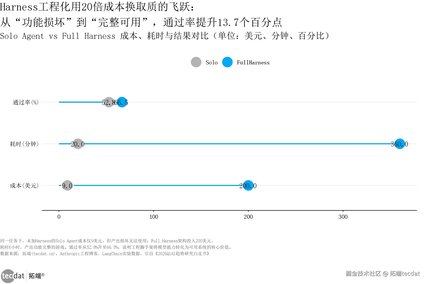 报告中的一组实验数据极具说服力:同一个任务,让一个裸奔的 Solo Agent 去干,成本只要 9 美元,20 分钟就跑完了,但产出是损坏的,根本没法用;而穿上了 Harness“全副武装”的 Agent,虽然成本飙升到 200 美元,耗时 6 小时,但产出的成果功能完整、可以直接交付。20 倍的成本差,换来的不是“更好”,而是“能用”和“不能用”的本质区别。