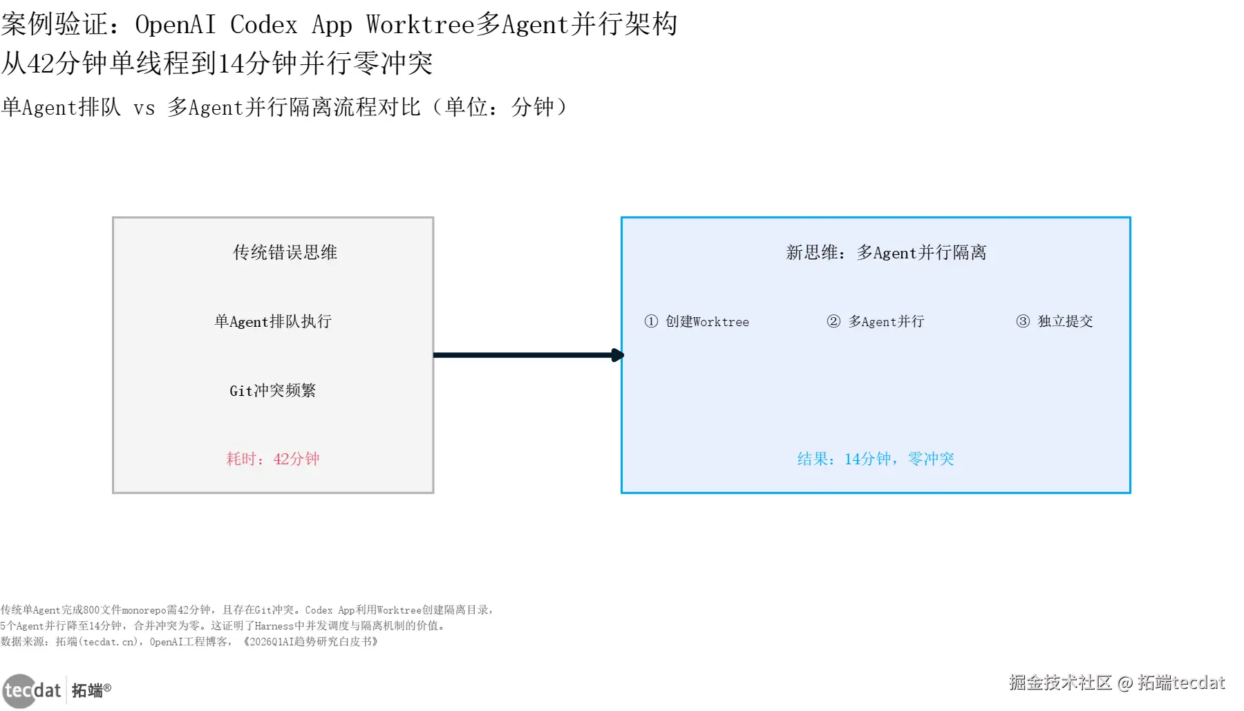 在一个包含 800 个文件、120MB 的 Node.js 项目中,传统单 AI 完成全部任务需要 42 分钟;而 Codex App 启用 5 个并行 Worktree 后,时间锐减至 14 分钟,且合并冲突为 零。这套 架构 **完美印证了 Harness 并发调度与隔离机制的巨大价值。