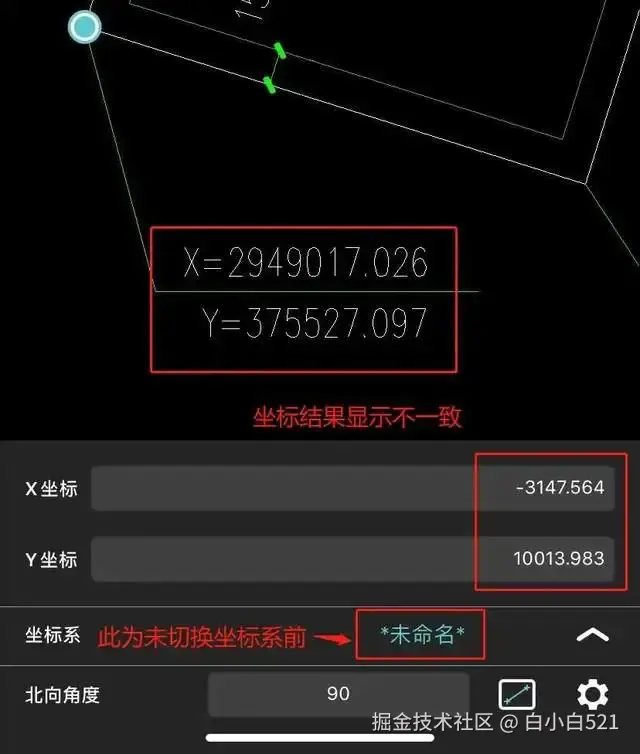 1、点击测量坐标后,发现测量的坐标结果与图纸上显示不一致;