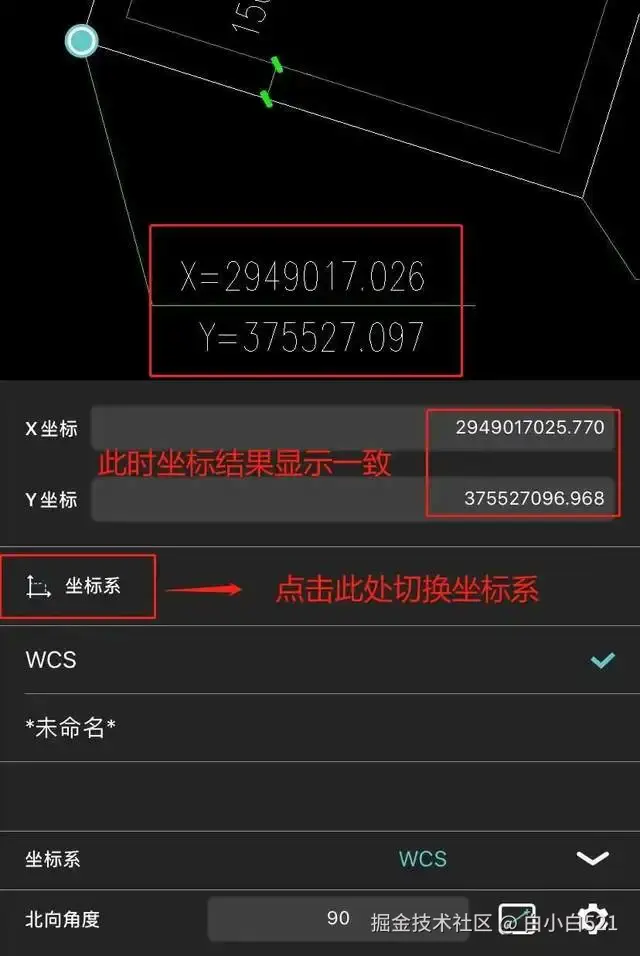 当你的图纸上包含多个坐标系的时候,如果测量坐标结果不一样,记得切换坐标系再测量,此时测量结果就是完全一致的。