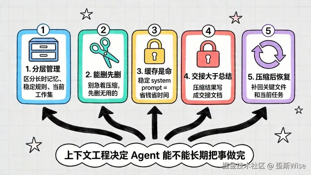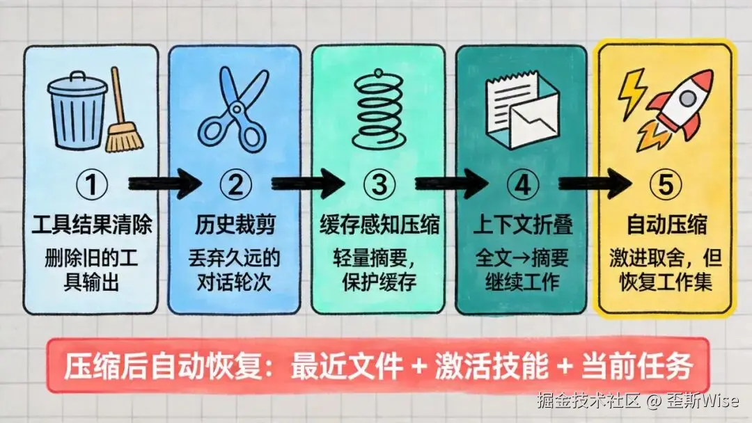 至少要补充回当前工作集,比如关键文件、已激活的技能和当前任务状态;否则 Agent 压缩完,很容易重新读一遍刚刚做过的事。