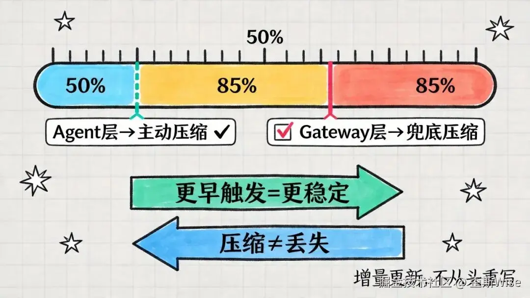 而 Agent 层则是 50% 的阈值,只要超过 50% 就主动压缩,尽早处理上下文,换取后续步骤的稳定性。